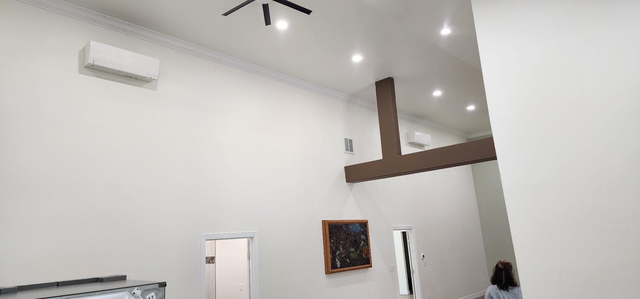 Rather than grouping several indoor units on one outdoor multi zone heat pump, the homeowner preferred a total of eight one-to-one Mitsubishi heat pumps. We installed each indoor unit as a dedicated match to its own outdoor compressor, meeting the customer’s specification for independent units throughout the home.